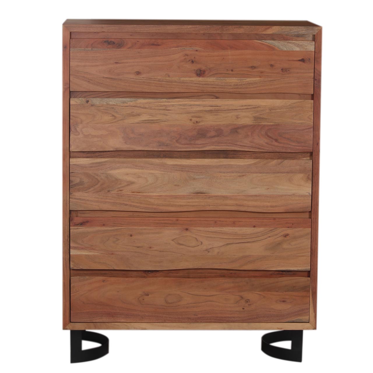 Five-drawer highboy dresser merges the rustic charm of acacia with the industrial feel of metal.