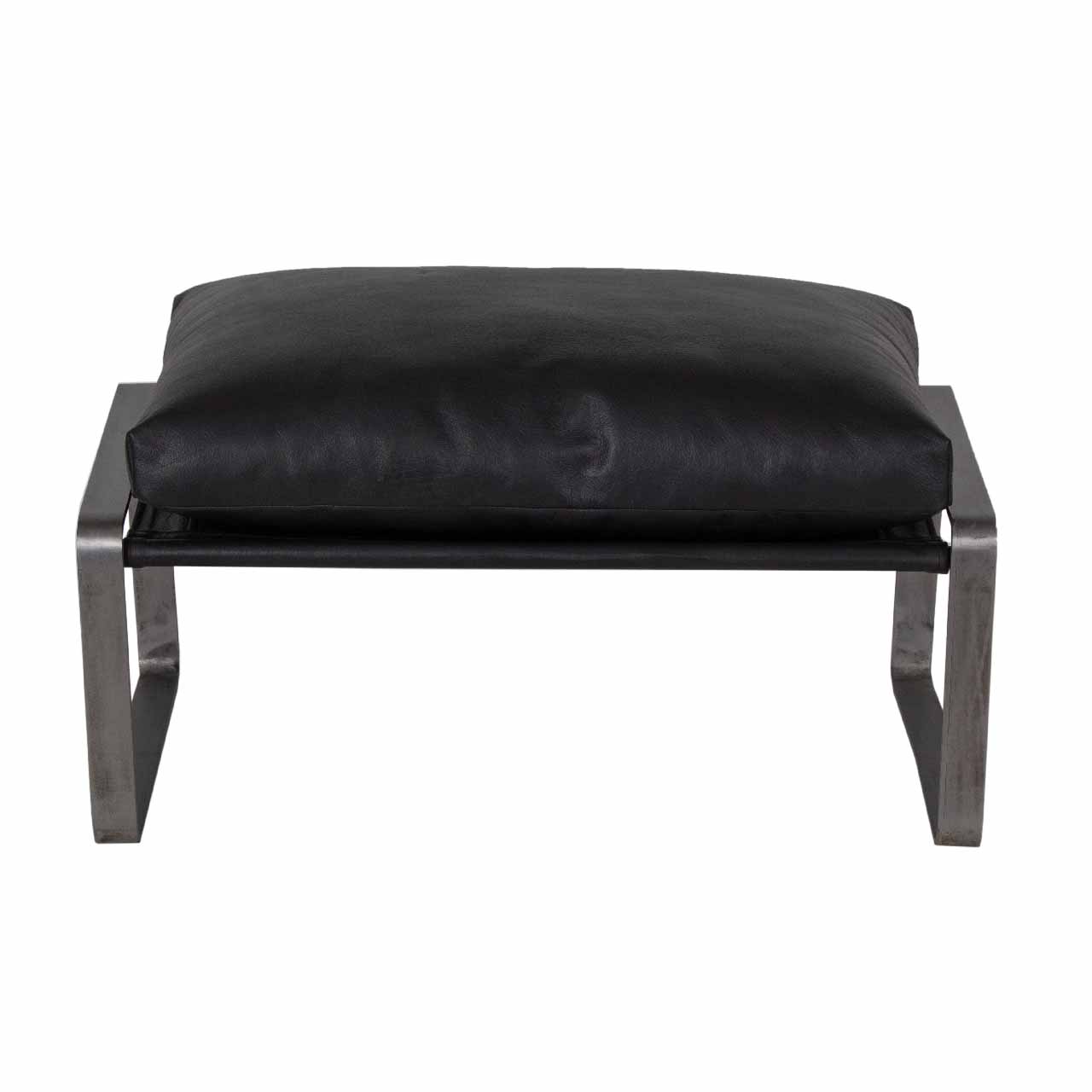 This stylish ottoman features a sturdy metal frame and plush buff leather upholstery, available in three versatile colors: classic black, warm brown, and contemporary chestro grey. Perfect for adding a touch of sophistication and comfort to any living space.